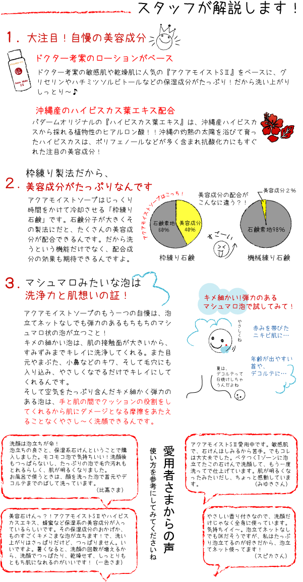 弾力のある泡がたつアクアモイストソープは、 大人気のアクアモイストSⅡやハイビスカス葉エキス、ヒアルロン酸などの美容液成分がたっぷり。
